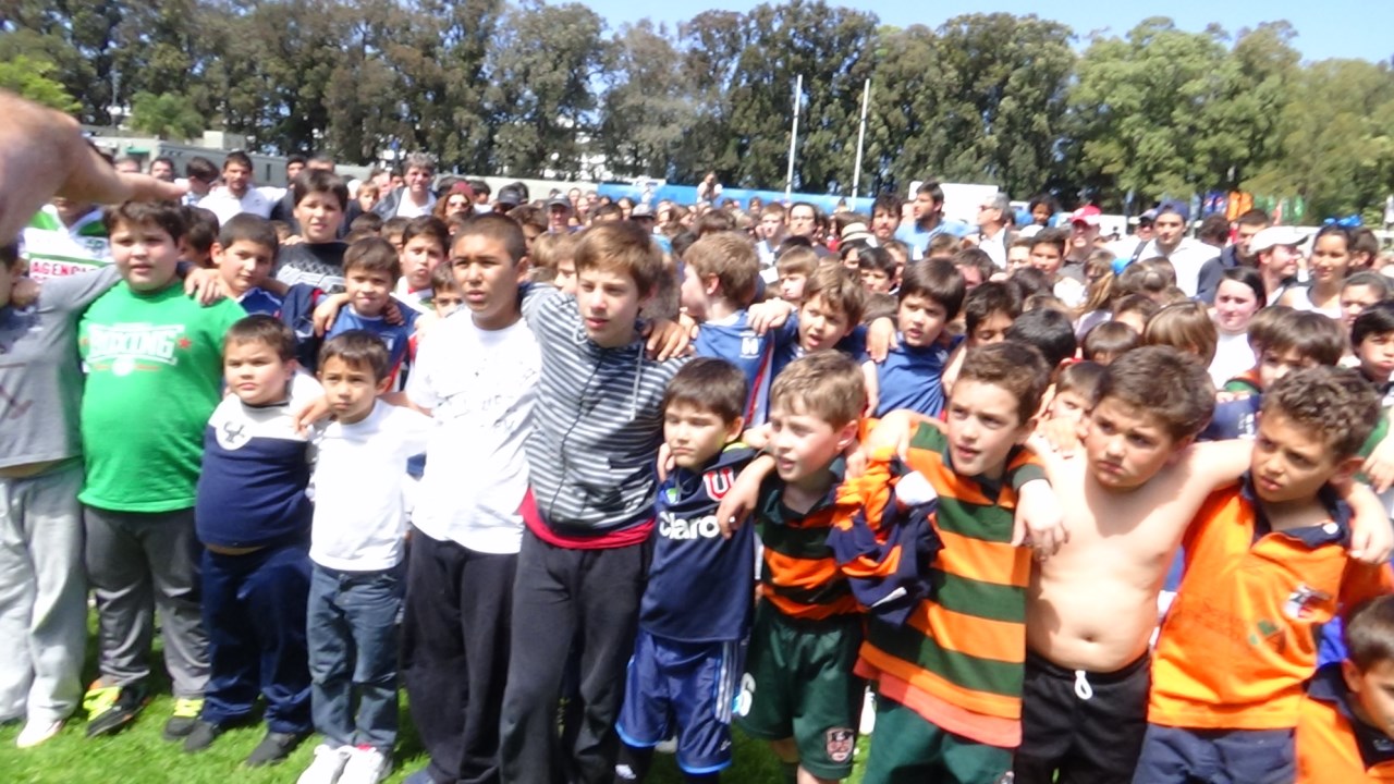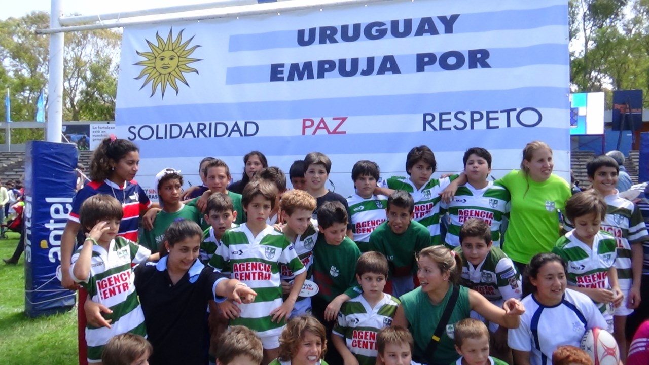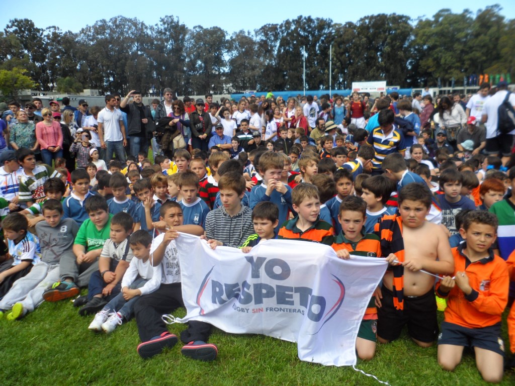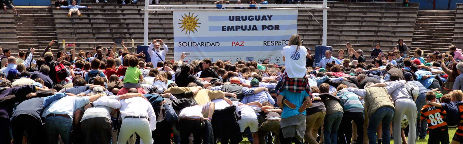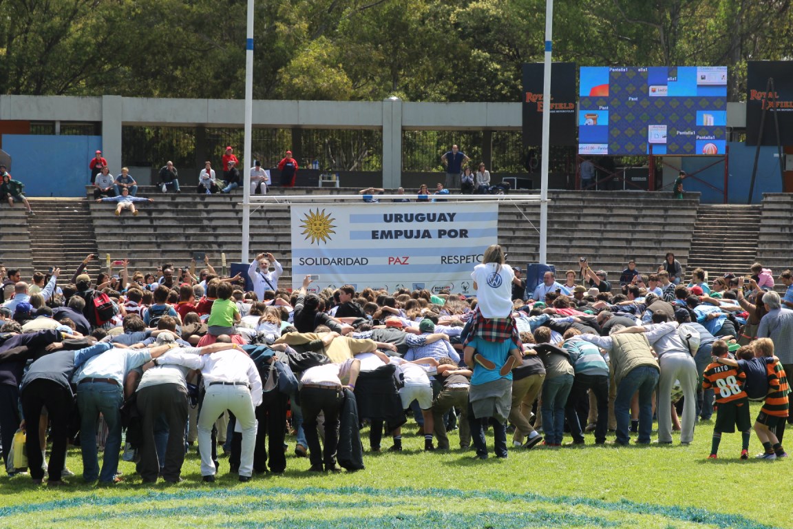 Thousands of people of all ages grouped together in a giant scrum in the Charrúa Stadium, before the Uruguay-Russia match within the qualifying rounds for the Rugby World Cup 2015 tournament. All of them, united in a symbolic hug, under a poster that read “Uruguay pushes for Solidarity, Peace and Respect” .
