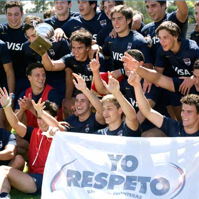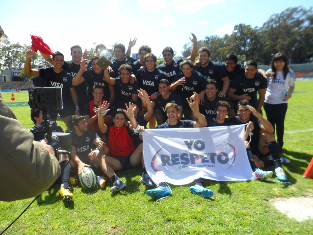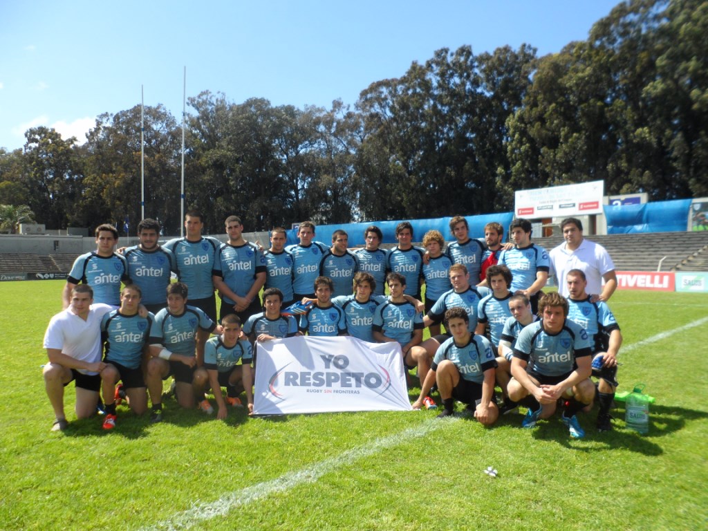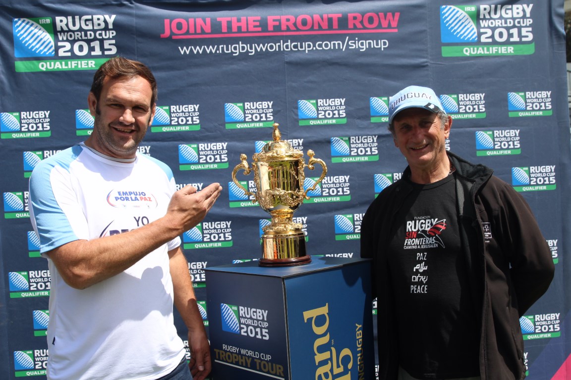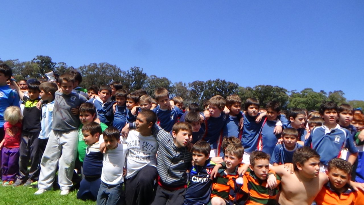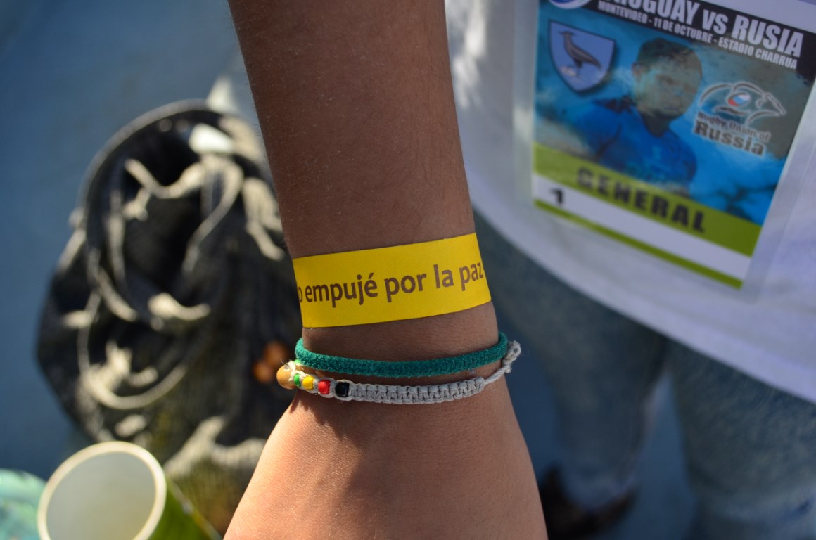 Thousands of people of all ages grouped together in a giant scrum in the Charrúa Stadium, before the Uruguay-Russia match within the qualifying rounds for the Rugby World Cup 2015 tournament. All of them, united in a symbolic hug, under a poster that read “Uruguay pushes for Solidarity, Peace and Respect” .